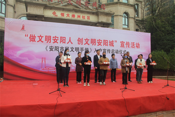 10月9日上午,由公司承辦的,安陽“做文明安陽人 創(chuàng)文明安陽城”宣傳活動暨《安陽市民文明手冊》入戶宣傳啟動儀式,在恒大綠洲新時代文明實踐站舉行。市委常委、宣傳部部長、副市長薛崇林,市人大常委會副主任張玲,市政協(xié)副主席李志弘,市委宣傳部副部長、市文明辦主任車俊朝,北關(guān)區(qū)委副書記、區(qū)長路錄平,北關(guān)區(qū)委常委、宣傳部長、副區(qū)長王洪忠,各級文明單位代表、社區(qū)代表、北關(guān)區(qū)志愿者代表,群眾代表參加儀式,儀式由車俊朝主持。公司黨委委員、副總經(jīng)理魏東帶領(lǐng)28名志愿者參加此次活動。