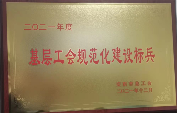 近日,公司工會被安陽市總工會授予“2021年度安陽市基層工會規(guī)范化建設標兵”榮譽稱號。