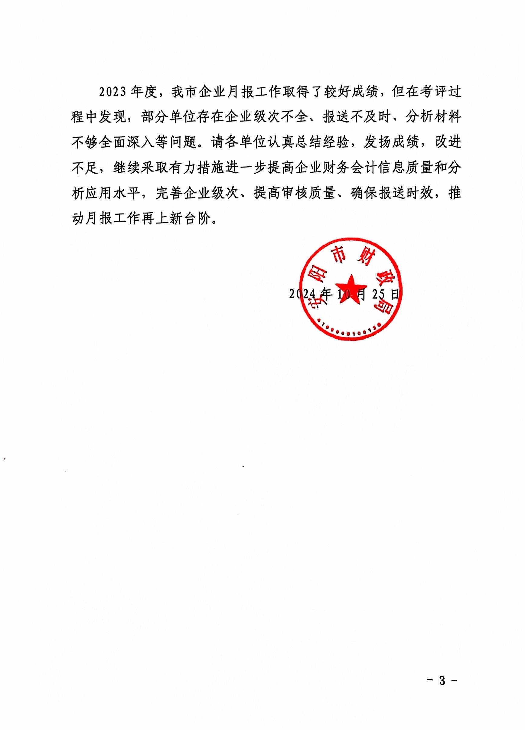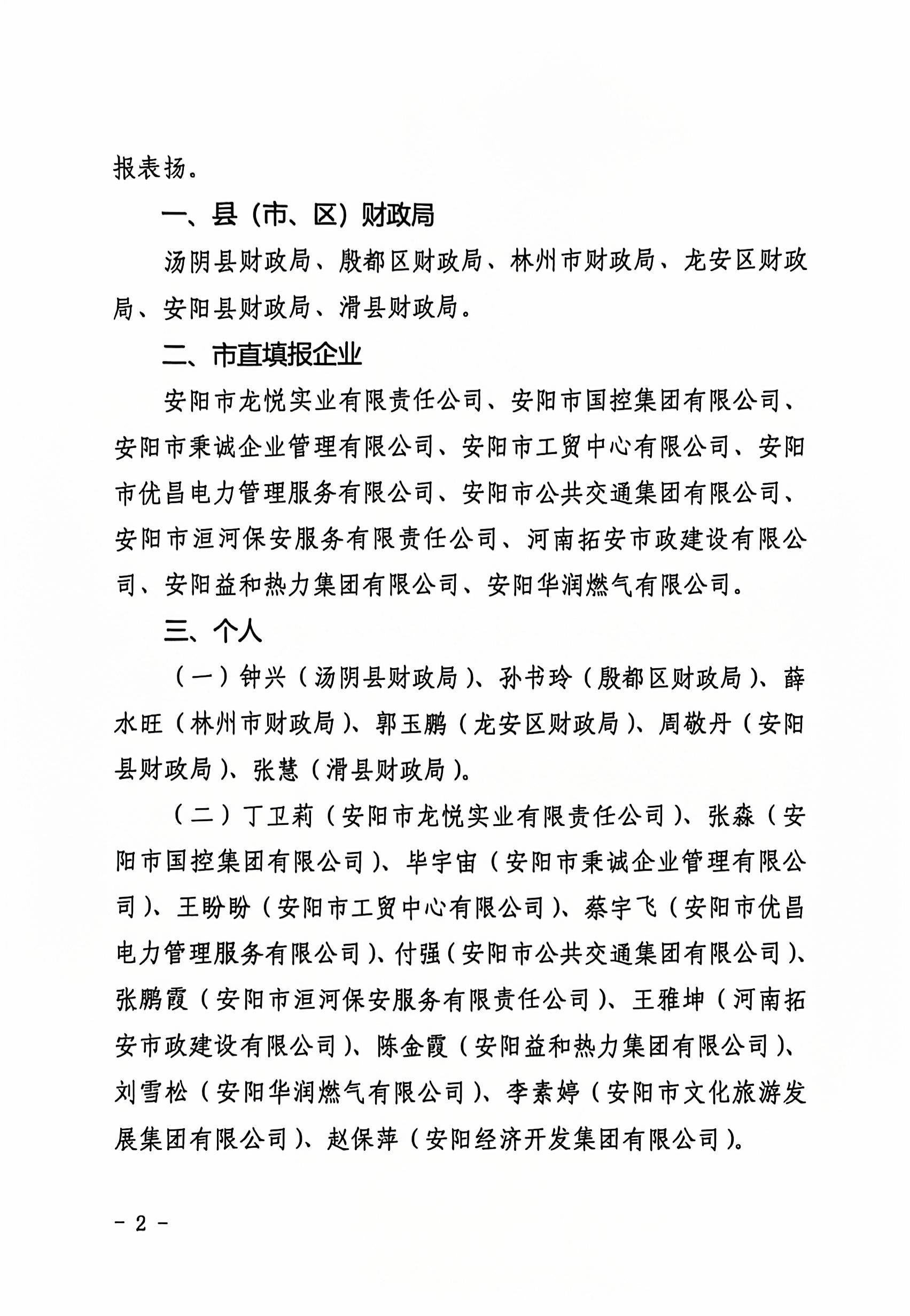 10月25日,安陽市財政局印發(fā)《關于2023年度企業(yè)經(jīng)濟效益月報工作的通報》(安財企〔2024〕5號),經(jīng)安陽市財政局綜合考評,洹河保安公司2023年度經(jīng)濟效益月報工作及財務部副主任張鵬霞同志,被通報表揚。