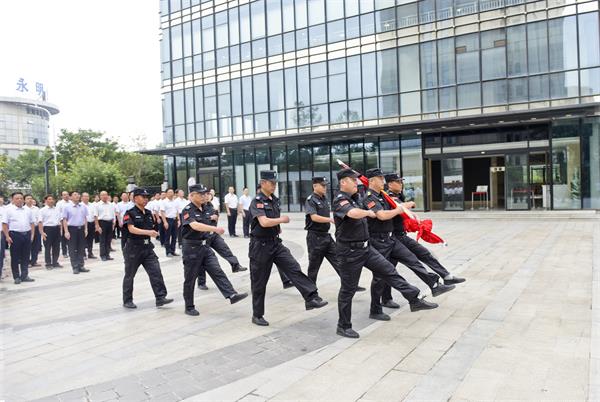 這隊(duì)特保隊(duì)員是人防一大隊(duì)駐聯(lián)通公司中隊(duì)特保隊(duì)員。只見4名標(biāo)兵著裝整齊,正步走向預(yù)定位置;3名護(hù)旗手在6名隊(duì)員護(hù)送下步伐整齊的走向升旗臺(tái)。護(hù)旗手上臺(tái)掛旗動(dòng)作嫻熟,伴隨著高昂的國(guó)歌,五星紅旗冉冉升起,全體參與人員向國(guó)旗敬禮。此刻,上升的不僅有國(guó)旗,還有全體黨員干部職工對(duì)黨和國(guó)家的熱愛和自豪感、愛國(guó)愛黨情懷。
