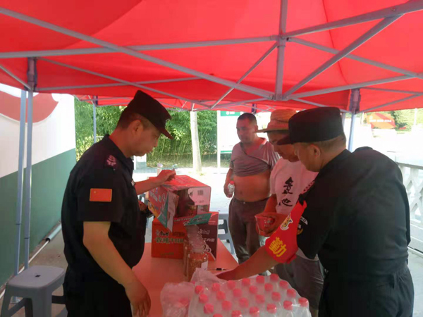 由于高溫干旱,防火成為糧庫的首要工作。保安員犧牲休息時(shí)間配合中儲糧,聯(lián)合公安、消防等部門開展消防安全大檢查并開展消防安全演練,增強(qiáng)了消防安全意識,提升了消防滅火能力。為確保出入糧庫車輛有序、安全,隊(duì)員每天早來晚歸,維護(hù)糧庫大門口秩序。看到糧農(nóng)排隊(duì)售糧,保安班長馮秋森安排隊(duì)員架設(shè)愛心涼亭,擺放愛心座椅, 備足熱水、礦泉水等防暑降溫用品,讓糧農(nóng)使用,防止中暑。他們又準(zhǔn)備了方便面分發(fā)到糧農(nóng)手中,解決他們的用餐。