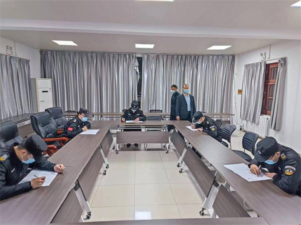 此次“大練兵”活動(dòng)主要采取戶外集中演練和消防演習(xí)相結(jié)合的方式進(jìn)行展示,其中演練項(xiàng)目包括隊(duì)列展示、擒敵拳、甩棍操等,他們動(dòng)作規(guī)范、排面整齊、英姿颯爽??己私M按照文件要求按照比例對(duì)隊(duì)員進(jìn)行筆試。