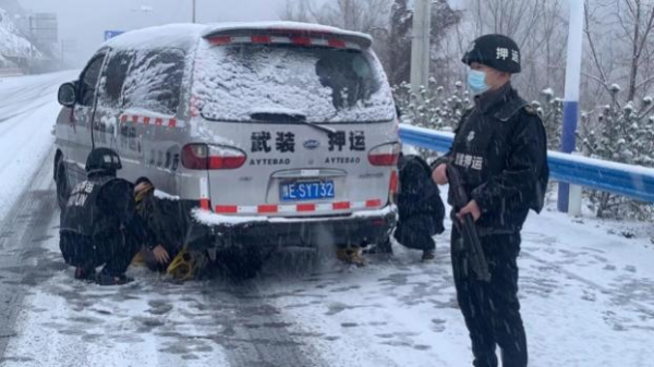 早上點名前,大隊長楊中朝就通過大隊微信工作群向各行中隊傳達了指示。一是要根據路況,精準研判,行車中減速慢行,不超車,車上備足兩套防滑鏈,對于上下坡路段積雪嚴重的要及時進行安裝防滑鏈,確認安全后再行駛。二是針對銀行網點的路況要及時和銀行網點進行溝通,車輛行駛不到的要及時進行上報,通過與銀行網點聯系,做到延遲送達或者暫不運送,謹記安全******。三是要根據上午運送的線路路況,對下午的出車接款時間做出調整,通過與銀行網點的溝通聯系,適時提前下午出車的接款時間,力爭在晚上溫度下降前安全返回。