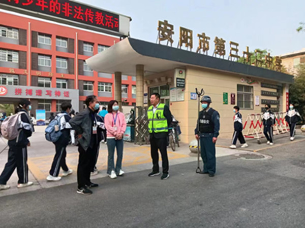 為進(jìn)一步強化校園安全保衛(wèi)工作,人防分公司以打造平安安陽,守護(hù)校園安全,確保校園師生安全為目標(biāo),從2023年4月18日開始,人防分公司領(lǐng)導(dǎo)及各大隊中層干部每天早7點至8點半準(zhǔn)時到各自分管的校園,疏導(dǎo)交通、維護(hù)秩序、保障師生進(jìn)校安全暢通,協(xié)助校園保安維護(hù)學(xué)校高峰期安全,為全市區(qū)校園安全保駕護(hù)航。