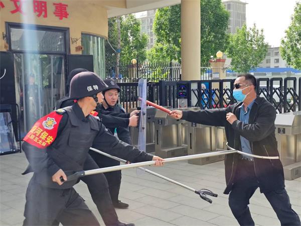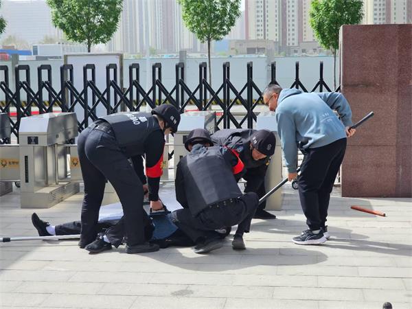 按照應急預案,當班的3名保安迅速分工。一人持防暴盾牌正面封堵“歹徒”前進路線,兩人持鋼叉從側(cè)后方包抄。面對“歹徒”的揮砍威脅,保安團隊采用“盾牌交叉防御+鋼叉鎖喉控制”戰(zhàn)術,逐步壓縮其活動空間。在與“歹徒”周旋的2分鐘內(nèi),最終協(xié)同將“歹徒”制服。此時園區(qū)已完成師生避險疏散,警方支援力量也同步抵達現(xiàn)場。