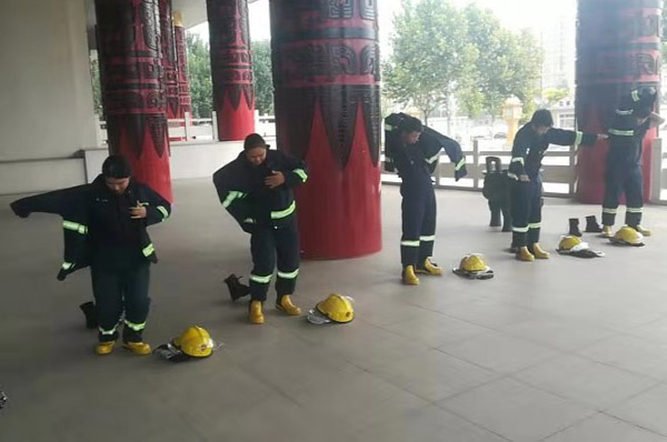 中隊隊員在每日消防訓(xùn)練前,在中隊長的帶領(lǐng)下認真學(xué)習(xí)消防安全知識,滅火器和消火栓等消防器材的使用方法,以及火災(zāi)發(fā)生時的應(yīng)急措施。中隊理論與實踐相結(jié)合,提高隊員的實際處置火險能力,組織隊員開展初起火災(zāi)的撲救、自我安全保護、組織人員疏散、消防設(shè)施和器材的操作等訓(xùn)練。訓(xùn)練中,特保隊員發(fā)現(xiàn)火情后,立即啟動火災(zāi)應(yīng)急處置方案,有的隊員迅速穿上消防服裝,觀察樓層火情,隔離起火設(shè)備,有的連接消防栓,打開滅火器撲滅火險。