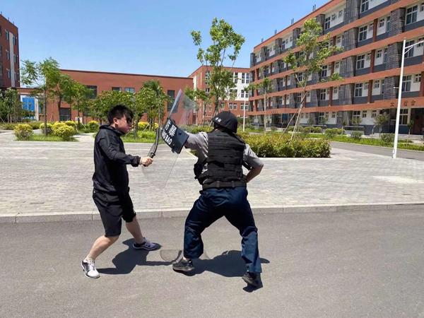 此次演練背景設(shè)置為:在安定祥和的氣氛中,保安正在門崗執(zhí)勤。9時30分許,一男子來到校門口,要求進入學校。保安在問其緣由后,依照規(guī)定拒絕其入內(nèi)。就在這時,該男子突然強行闖崗。保安見狀,疾步擋在男子前面,男子用棍棒向保安襲來,保安手持盾牌抵擋。男子見無法傷到保安,轉(zhuǎn)身沖向院內(nèi)的教學樓。保安沖到男子面前,用鋼叉將其牢牢控制住,在同事的幫助下迅速合力將“歹徒”制伏。