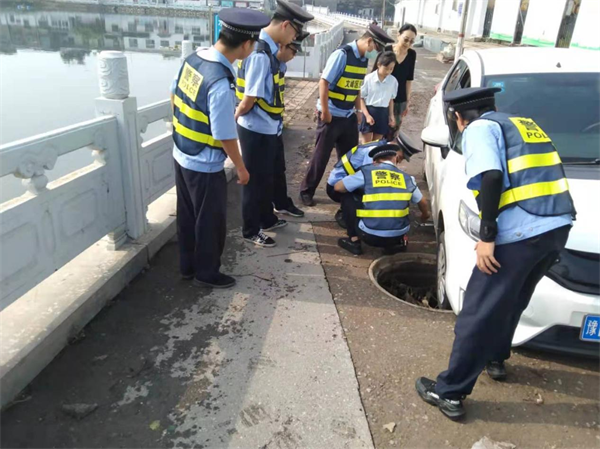 7月24日上午9時(shí)許,隊(duì)員楊科、李思聰、石玉濤等人,巡邏至文峰路西營街交叉口時(shí),發(fā)現(xiàn)一輛白色轎車的右前輪陷在窨井里,趕忙上前查看情況,應(yīng)是前幾日暴雨把窨井蓋給沖走了,導(dǎo)致車輛右輪卡在了窨井口。隨后,隊(duì)員們有的協(xié)助車主張女士,使用千斤頂把車輛頂起,有的在附近尋找被雨水沖走的窨井蓋。隊(duì)員們把找到井蓋放回原位,幫助車主安全離開,車主張女士一再表示感謝。