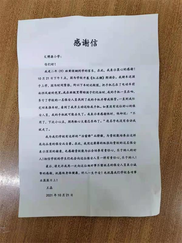 10 月21 日下午1點(diǎn),該校二年級(jí)(9)班黃煜嫻的家長(zhǎng)王晶帶孩子來校參加《紅石榴》朗誦會(huì)?;琶χ?,下車時(shí)不慎把手機(jī)忘在了電動(dòng)車前面擋風(fēng)被的兜里,便匆匆進(jìn)了學(xué)校。因忙于幫助孩子們化妝,王晶根本想不起手機(jī)的事。后來她的手機(jī)一直在響,正在門口執(zhí)勤的保安員趙海利循聲找到手機(jī),便幫她保管了起來。待王晶忙完回來推車時(shí),趙海利主動(dòng)把手機(jī)交給了她。因?yàn)榇箝T外人行道過往的人很多,要不是這名保安給她把手機(jī)保管起來,肯定是找不回來了。王晶驚喜之余,表示要感謝他時(shí),趙海利善意提醒道:“不用了,下次小心點(diǎn),別再粗心大意忘東西了?!闭f完便忙他的去了。