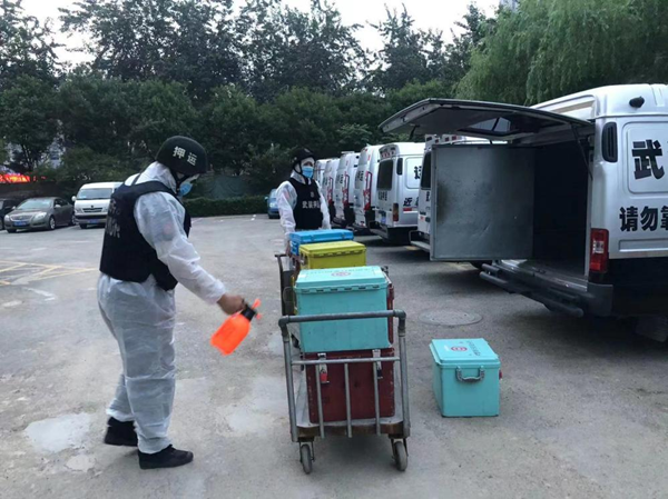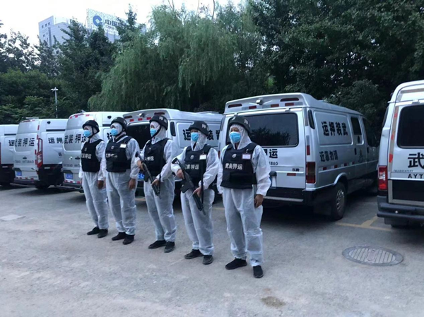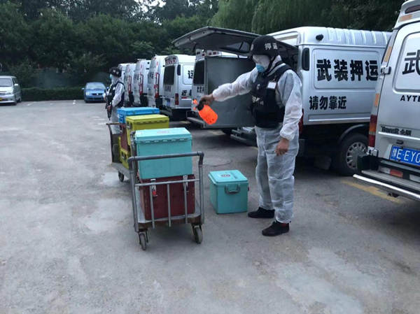 為確保守押隊員人身安全,同志們按照《疫情防控期間押運應急工作預案》,嚴格執(zhí)行辦公區(qū)域和押運車輛的消殺、防護裝備的檢查與消毒等防疫程序,執(zhí)行勤務時身穿全套防護服。