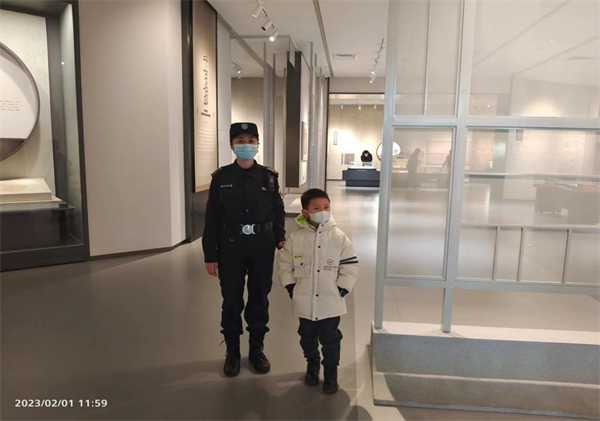 2月1日上午12時(shí),中國(guó)文字博物館徽文館內(nèi)正值游客高峰期,一名老年游客慌慌張張地找到正在巡邏的特保隊(duì)員尋求幫助,稱自己和孫子在館內(nèi)游覽時(shí)不小心走散了,由于游客人流量較大,尋找無果,心急如焚。