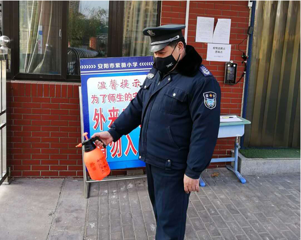 疫情發(fā)生后,人防一大隊(duì)80名校園保安按照公司、大隊(duì)和學(xué)校領(lǐng)導(dǎo)要求始終戰(zhàn)斗在抗疫工作前沿。在這場(chǎng)看不見硝煙的戰(zhàn)疫中涌現(xiàn)出許多沖鋒陷陣、主動(dòng)協(xié)助學(xué)校開展防疫工作的保安隊(duì)員。紅廟街小學(xué)保安班長(zhǎng)袁和平,每天除了做好本職工作,對(duì)進(jìn)入校園的人員測(cè)量體溫,認(rèn)真登記,守好學(xué)校防控疫情的首道防線外,還主動(dòng)給學(xué)校校園和辦公室噴灑消毒液。無論白天與黑夜,只要客戶需要,他都隨叫隨到,為學(xué)校防控疫情工作做出自己的貢獻(xiàn)。