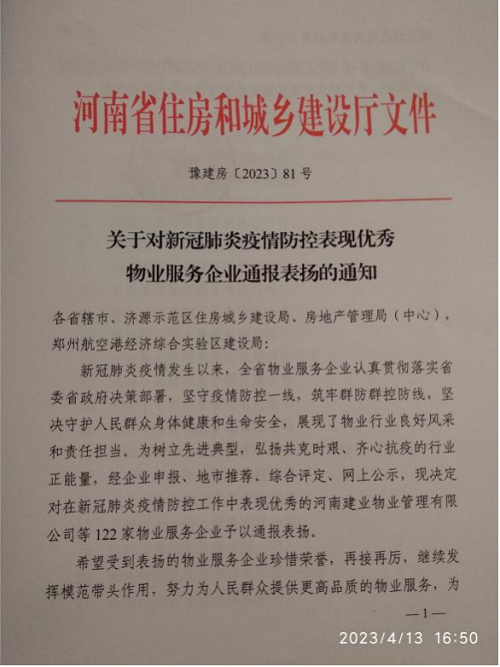 4月8日,河南省住房和城鄉(xiāng)建設(shè)廳通報表揚了全省新冠肺炎疫情防控工作表現(xiàn)******的122家物業(yè)服務(wù)企業(yè),安陽鼎誠物業(yè)服務(wù)有限公司榜上有名。