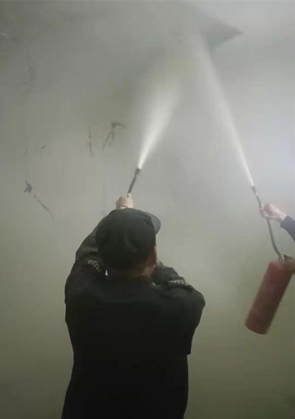 4月21日早上7點40分許,人防二大隊七中隊中隊長李伏林帶領保安員宮勝偉、趙雁貴正在文博源小學門口值勤。他們警惕地注視著周圍情況,守護師生安全,疏導門口車輛,迎接師生有序進校。這時,二道門一位女老師忽然聞到一股刺鼻的膠皮味,隊員們聞聲立即四處查找異味的來源,發(fā)現(xiàn)后院食堂方向黑煙滾滾。不好,失火了!早上護校來到該校的副大隊長張海林立即指揮隊員向著火處沖去。李伏林率先操起滅火器同隊員來到餐廳著火處,邊通知相關人員斷掉電源和燃氣,邊投入滅火。