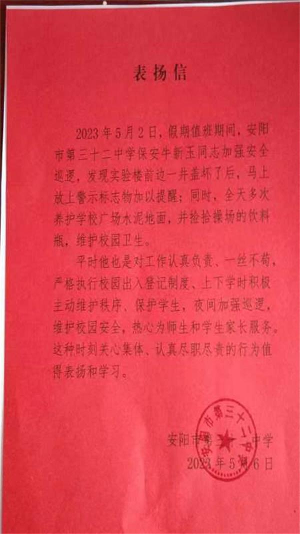 信中說道:5月2日,假期值班期間,牛新玉同志加強(qiáng)安全巡邏,發(fā)現(xiàn)學(xué)校實(shí)驗(yàn)樓前邊一井蓋壞了后,馬上放上警示標(biāo)志加以提醒;同時(shí),全天多次養(yǎng)護(hù)學(xué)校廣場水泥地面,并撿拾操場的飲料瓶,維護(hù)校園衛(wèi)生。平時(shí)牛新玉同志對工作認(rèn)真負(fù)責(zé)一絲不茍,嚴(yán)格執(zhí)行校園出入登記制度、上下學(xué)時(shí)積極主動(dòng)維護(hù)秩序、保護(hù)學(xué)生,夜間加強(qiáng)巡邏,維護(hù)校園安全,熱心為師生和學(xué)生家長服務(wù)。這種時(shí)刻關(guān)心集體、認(rèn)真履職盡責(zé)的行為值得表揚(yáng)和學(xué)習(xí)。