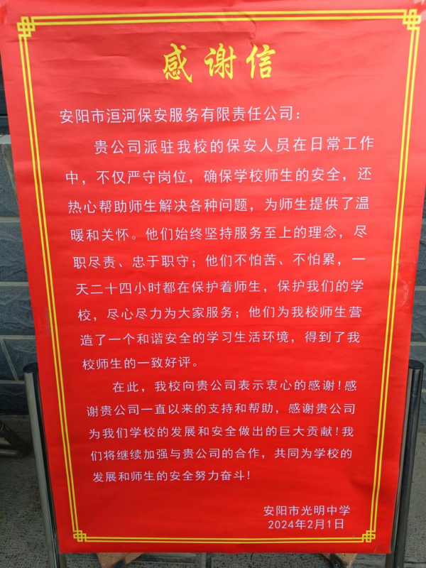 2024年2月3日,在安陽市光明中學(xué)年終工作總結(jié)會上,學(xué)校領(lǐng)導(dǎo)將一面印有“最平凡的崗位、最貼心的守護”的錦旗送到人防三大隊副大隊長劉慶剛手中,并致信表揚,感謝人防三大隊駐安陽市光明中學(xué)保安班對維護校園安全以及校園周邊治安秩序做出的積極努力和貢獻(xiàn)。