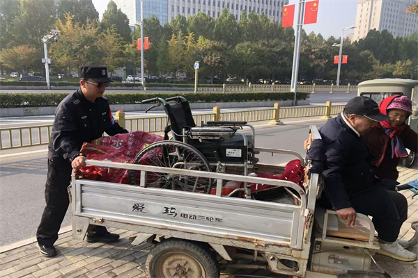 11月1日上午,特保隊(duì)員李志強(qiáng)在中院南門外發(fā)現(xiàn)有兩名信訪群眾身體不便前來中院上訪,他們年紀(jì)較大且腿腳不便,李志強(qiáng)耐心溝通了解后,主動上前攙扶并幫助他們把輪椅裝上三輪車,協(xié)助老人推動三輪車前去信訪大廳。