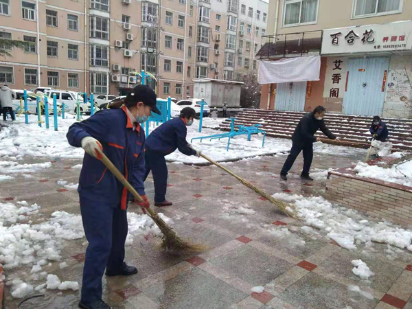 圖為物業(yè)公司員工在清掃服務(wù)小區(qū)積雪。