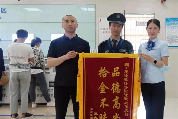 “太感謝你們了,信息年代真是寧愿丟點錢也不能把手機丟了!手機儲存的信息太多了,一旦丟了,后果怕不堪設想。如果不是你們撿到,我也不會這么快找到手機?!?5月21日上午11點,王先生向人防四大隊派駐中國建行弦歌大道支行保安韓永剛送來了一面寫著“拾金不昧 品德高尚”的錦旗,表揚他拾金不昧的高尚品德。