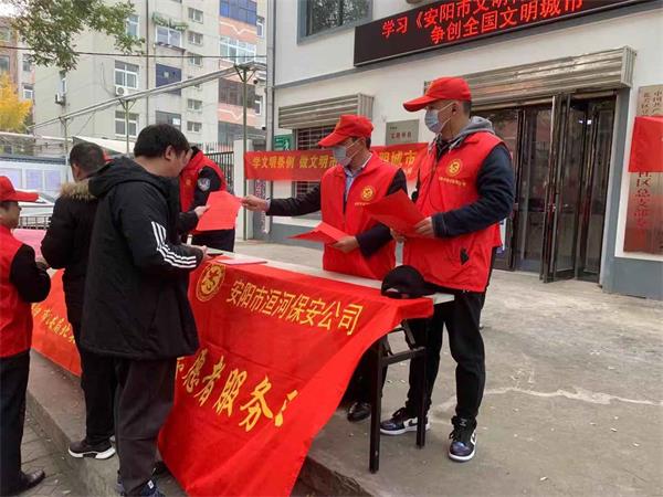 為切實發(fā)揮文明單位在文明創(chuàng)建工作中的示范******作用,營造******文明城市創(chuàng)建氛圍,提高市民文明道德素質(zhì),根據(jù)《安陽市文明行為促進(jìn)條例》宣傳貫徹以及“百萬志愿者進(jìn)社區(qū)”有關(guān)活動安排,11月27日下午,公司積極響應(yīng)市文明辦活動號召,組織10余名志愿者到盤庚中社區(qū)開展了《條例》宣傳進(jìn)社區(qū)活動,通過文明勸導(dǎo)、示范******,引導(dǎo)和教育廣大市民養(yǎng)成良好的文明行為,營造了文明禮讓的良好氛圍,樹立了安陽市洹河保安公司市級文明單位的良好社會形象。
