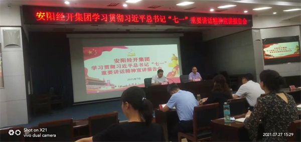 2021年7月27日下午,安陽市洹河保安公司黨委組織10名黨員干部,參加了由中共安陽經(jīng)開集團(tuán)黨委舉辦的學(xué)習(xí)貫徹習(xí)近平總書記“七一”重要講話精神宣講報(bào)告會(huì),會(huì)議邀請(qǐng)河南護(hù)理職業(yè)學(xué)院馬克思主義學(xué)院副院長、副教授張艷林主講,會(huì)議由經(jīng)開集團(tuán)黨委書記、董事長齊方同志主持。